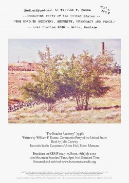‘The Road to Recovery’, written by William F. Dunne, was aired in 1938 on KGIR Butte; a low bandwidth station started one year before the Great Depression. The broadcast explains the Communist Party of America’s support of new deal work programs as a response to the increasingly fascist nature of monopoly capital and its barely veiled plan to reshape the depression era US in its own interests.
