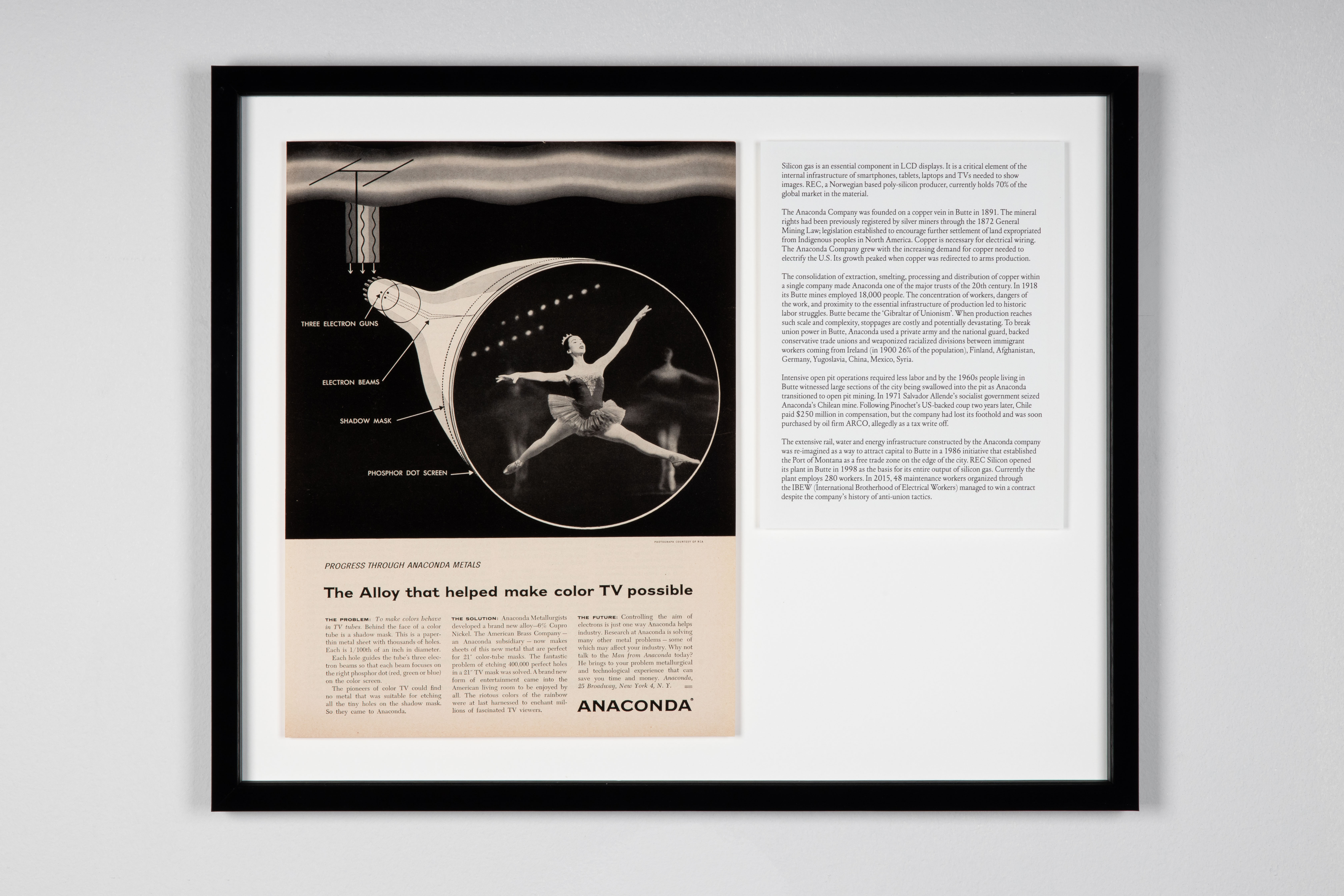 Marcus Daly founded the Anaconda Company (ACM) on a mineral claim in Butte, Montana, in 1891. Vertical integration of mining, smelting, and processing established the ACM’s monopoly on copper production. The wealth accumulated by the company was predicated on the availability of a largely immigrant work force willing to undertake high risk labor, as well as the theft and devastation of hunting and fishing grounds used by Salish, Cree and Pend d’Oreille peoples. The company utilized conservative trade unions, private gunmen and the national guard to control workers. Racialization was frequently weaponized to fracture any solidarity between a workforce comprised of native and African American workers as well as settlers from places including Ireland, Finland, China and the Balkans. These conditions were also the source of militant organizing; the Industrial Workers of the World (IWW) had a strong presence in Butte, striving for abolition of the wage system by organizing internationally across branches of industry.